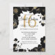 Falso elegante e moderno imprimiu flores pretas acentuadas de ouro, convites de festas de celebração de 16 anos. Este design clássico e sofisticado é perfeito para a garota de aniversário de classe, tendências e na moda. Personalize com sua própria mensagem na frente e um monograma personalizado inicial no verso. Todas as impressão de fotos.