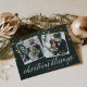 O cartão com fotos de férias elegante apresenta um rico fundo verde caçador, apedrejado com terras leves de folha de ouro falso no topo. Adicione duas fotos quadradas favoritas moldadas por uma borda branca. "Bênçãos de Natal" aparece na parte inferior em letras brancas de escrita em caligrafia, com seu nome de família preso na design. Personalize as costas com uma saudação de Natal adicional e personalizada.