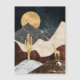 Uma surpreendente placa de saudação do deserto do abstrato, com uma silhueta de girafa ouro debaixo de uma lua de ouro brilhante, com montanhas em camadas texturizadas com mármore, cacto do deserto e um céu noturno estrelado a brilhar. A combinação de tons de terra, sotaques de ouro metálicos e detalhes celestes cria um cartão de saudação moderno, místico e inspirado na boemia.