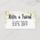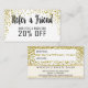 Moderno e glamoroso o ouro impresso este falso salpicado brilha no branco, consulta um amigo o cartão da referência que do disconto é perfeito para o proprietário empresarial na moda e à moda. Este cartão de vista elegante e profissional é a maneira perfeita de mostrar seus clientes que você se importa com seu negócio. Personalize este cartão para todo o negócio, apenas edite o texto e adicione seus próprios detalhes pessoais.