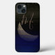 nome personalizado e inicial monograma no iPhone 13 Caso com lua ouro cônica e abstrato de brilho dourado.