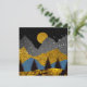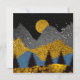 design de paisagem da montanha abstrato em tons de ouro, preto e azul em tons negros, com um luar e pássaros.