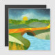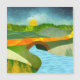 Cena de abstrato de um rio que passa por uma ponte de pedra com colinas rolantes e uma estrada de ouro em cores e texturas ousadas.