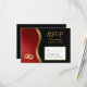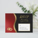 Um cartão RSVP preto, vermelho e dourado. Alianças de casamento unidas para um aniversário ou outra ocasião.
