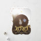 Um cartão de Dia de os namorados de fotografia de cheio em forma de chip com uma folha falsa "xoxo" de cor branca e ligeiramente flutuante para um toque moderno.