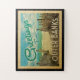Esta saudação do Outer Banks vintage postcard design apresenta uma praia arenosa com uma bela água turquesa oceânica e acima do mar, um céu azul com nuvens brancas e onduladas. No estilo viagens vintage.