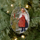 Descrição: Uma menina loura pequena bonito no traje popular tradicional está em uma cadeira para adicionar uma vela à árvore de Natal.