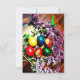 Aqui está um simples cartão de páscoa rústico com ovos de páscoa coloridos e ramos de flores lilás.
