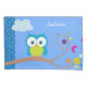 Esteira personalizada, adorável para um garoto com uma coruja sorridente de olhos grandes sentado em um galho com formas geométricas para folhas. Nome personalizável ou qualquer texto desejado.