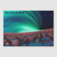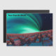Uma aurora, verde devido ao oxigênio ionizado, aparece baixa no horizonte, uma cidade está no primeiro plano. Adicione seu próprio texto.