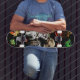 Um skate que apresenta as criaturas da fantasia de P é para Phoenix.