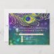 Placa de resposta RSVP correspondente. Este design é feito com penas de pavão pintadas à mão com aquarela pintada à mão, adornadas com joias de diamante desenhadas graficamente (NOTA: trata-se de um convite impresso à mão, não há joias reais, brilho dourado, folha metálica ou tinta metálica usada) sobre um brilho colorido de boque, luzes cintilantes em fundo profundo, roxo, azul, aqua e verde. O lado inverso é o plano de fundo das luzes delimitadoras que coincidem com o quadro. Altere facilmente o texto usando os campos modelo fornecidos. Eterno, estilo clássico tradicional com uma reviravolta moderna para uma elegância de gravata negra. Arte de uma artista internacionalmente licenciada, Audrey Jeanne Roberts, copyright.