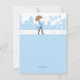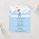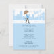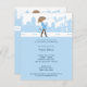 Este convite contemporâneo tem uma silhueta azul pálido de uma arquitectura da cidade como um fundo com um gráfico de vestir-se adorável da mãe expectante azul e de guardarar um guarda-chuva quando andar abaixo da rua que leva um saco de compras. É escrito no céu: "É um menino". Uma coroa decora o "b" no menino. A parte traseira deste design superior tem o mesmo tema da cor. Há uma abundância do texto customizável na parte dianteira deste convite para que você adicione sua informação do partido.