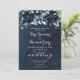 Peões azuis marinhos em cascata com folhagem verde-prateada de eucalipto contra fundo azul-d-água com uma caligrafia branca com fonte de rico anunciando seu casamento.