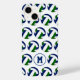 Esta capas de iphone temática divertida de voleibol apresenta um padrão simples de volichões que têm painéis azuis, verdes e brancos num fundo branco personalizável - personalizado com o monograma do atleta - por katz_d_zynes