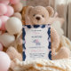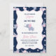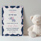 Convite para chá de menina apresentando um padrão lindo de elefante para bebês com elefantes rosa e cinzas e flores cor-de-rosa giras em um fundo personalizado azul escuro.