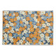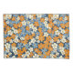 Um padrão floral vibrante cobrir toda a imagem. Flores pequenas e estilizadas em tons de laranja, azul claro e esbranquiçado são dispostas densamente sobre um fundo azul marinho. As flores têm um aspecto ligeiramente imperfeito, pareceria, com variações na saturação e forma das cores que dão ao padrão um aspecto texturizado, quase pintado à mão. O padrão repetido cria um efeito visual alegre e ocupado.