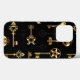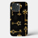 Padrão perfeito de chaves antigas, douradas e silhuetas em fundo preto.