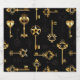 Padrão perfeito de chaves antigas, douradas e silhuetas em fundo preto.