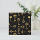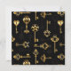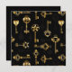 Padrão perfeito de chaves antigas, douradas e silhuetas em fundo preto.