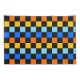 Um vibrante padrão xadrez com fileiras alternadas de quadrados laranja, amarelo, azul claro e azul contra um fundo preto. O design é ousado e enérgico.