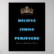 O fundo preto elegante em papel de poster de qualidade faz um belo trabalho de arte de encorajamento. Uma coroa glamourosa amontoada acima de três palavras: Acredite em Strive Persevera junto com uma citação de "Os sonhos se tornam realidade". Comprar como está ou personalize ainda mais com o botão personalizar ou adicionar um quadro. Imagem licenciada