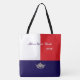 This cute stylish large tote bag is shown in a red, white and blue color block style with a silver pageant crown known as the afterglow series. Custom text.