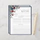Projetada para acompanhar nosso Binder de Receita do Chá de panela correspondente, parte de um Chá de panela Suite correspondente, esta placa de receita bonito apresenta um buquê de flores azuis e burgundy marinhos, bordadas em caligrafia bonito e azul de marinho e escrita à mão. Há muitas linhas para a receita, e a parte de trás corresponde à frente, para que cada convidado possa dar à noiva duas receitas. Uma margem também foi deixada na página para acomodar a margem. Parte de uma suíte coordenada. Ver suite aqui: https://www.zazzle.com/collections/elegant_navy_blue_burgundy_botanical_bridal_shower-119592964187643986 Contacte o designer para produtos correspondentes. Copyright Anastasia Surridge for Elegant Invites, todos os direitos reservados.