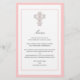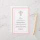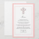 Uma elegante cruz desenhada com caracóis e rico de flur de lis padrões, coordena-se perfeitamente com os nossos convites de batismo, comunhão e confirmação. Cada linha pode ser personalizada para o seu menu. O design de cruz cor-de-rosa bonito está disponível em autocolantes e postagens correspondentes.