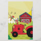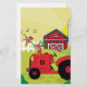 Folhas de raspagem bonitas que apresentam um galo sentado num trator num campo de campo com um grande celeiro vermelho no fundo.