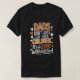Uma camiseta preta com um design tocante com o texto "Pais não apenas adoram seus filhos é um amor sem fim" em letras brancas e laranja, acentuadas com pequenos corações laranja. A camisa é vestida por uma pessoa de pé sobre um fundo comum.