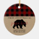 O primeiro Natal como o ornamento do pai com vermelho e o preto verificam o teste padrão da xadrez e o urso da papá em kraft.