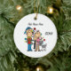 Um ornamento cerâmico bonito e divertido, com um pai, mãe, menino de criança, menina, e cão de cinza em frente à árvore de férias!