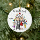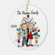 Um ornamento cerâmico redondo bonito do feriado do Natal da lembrança caracteriza uma figura família da vara que inclui um pai, uma mamã, uma menina, e um menino na frente de uma árvore de Natal decorada com áreas que você pode personalizar com seu nome de família e o ano em curso! Este ornamento bonito da lembrança do feriado faz um grande presente para que a família nova comemore um ano especial!