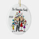 Um ornamento cerâmico redondo bonito do feriado do Natal da lembrança caracteriza uma figura pai, mamã, menino pequeno em um boné azul da bola, e uma menina da vara em um vestido roxo na frente da árvore e das áreas decoradas de Natal onde você pode adicionar o texto que inclui o nome do ano em curso e de família. Este é um presente adorável para que toda a família comemore o ano!