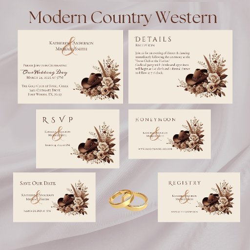 Anuncie seu grande dia em estilo com esses sofisticados convites de casamento ocidentais modernos e elegantes para o País Elegante. Apresentando delicadas flores bordadas neutras e um charmoso chapéu de vaqueiro, eles misturam o charme russo ocidental com elegância moderna. Impressos em estoque texturizado premium, esses convites são perfeitos para fazendas, celeiros ou casamentos country-chic. Ponha o tom para o seu inesquecível casamento country Western com estes convites elegantes e explore a coleção para um casamento temático perfeitamente ocidental!
