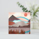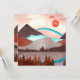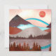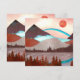 Paisagem de montanha em vermelho e azul com um lago e um arco-íris azul arrojado.