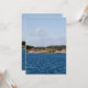 Paisagem da costa sueca com água azul e céu e cascos vermelhos e um barco. Fotografia.