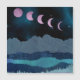 Esta linda paisagem de abstrato mostra uma cena de montanha noturna com uma lua rosa-forte mostrada em fases que se estendem sobre o céu. O design usa cores azul, ciano, rosa e cinza.