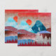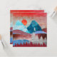 Um belo design de paisagem abstrato com a montanha e a cena da floresta e uma águia pousando em uma árvore em tons vibrantes de azul, ciano, prata e creme.