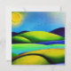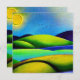 Design de paisagem digital com aquarela em tons vibrantes de azul, verde e amarelo com sol e aves.
