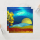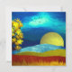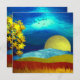 Um belo design de paisagem abstrato com um céu único que se assemelha a ondulações em líquido e uma lua, montanhas e uma árvore ouro.
