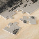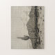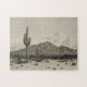 Esta design de quebra-cabeça apresenta uma representação de paisagem desértica que inclui alguns cactos e montanhas.
