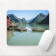 Mousepad com uma paisagem com um barco e um boathouse na água imóvel do fiorde Fjaerlandsfjord com as montanhas no fundo em Noruega