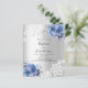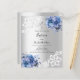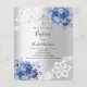 Um convite elegante para o batismo. Um fundo com aspecto fino prateado decorado com flores azuis, rosas, rendas e uma cruz de ouro. Personalize e adicione um nome e detalhes. 1 folha = 1 convite impresso de borda a borda.