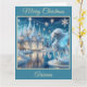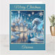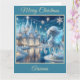 Um belo cavalo branco de fantasia fica majestosamente em frente a um elegante palácio de gelo no inverno neste encantador cartão de Natal. Adicione seu próprio texto personalizado.
