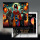 Convites de festas de Halloween. Palhaço assustador, vampiros e zombies segurando balões laranja e preto em frente a um convite de festas de Dia das Bruxas da Lua de cheio feito em um estilo de Carnaval de BD.