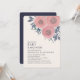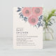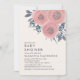 Nossos belos convites florais para o chá de bebê estão enterrando com elegantes flores aquáticas em tons chicos de rosa pincelado e suave. O design apresenta um spray de papoila no canto superior direito, rodeado por folhas e botões em verduras, cinzentos e azuis macios. Adicione os detalhes do seu chá de fraldas em azul-da-meia-noite moderno e cinza. O fundo é marfim pálido.