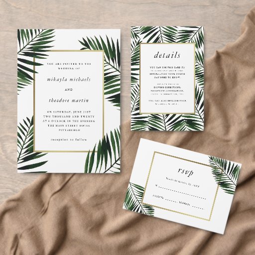Palma simples e chica deixa o cartão de resposta do casamento. Veja esta coleção para coordenar itens de casamento.