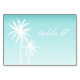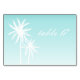 Um cartão de lugar da mesa de casamento com uma ilustração de duas palmeiras sobre um fundo aqua ombre.